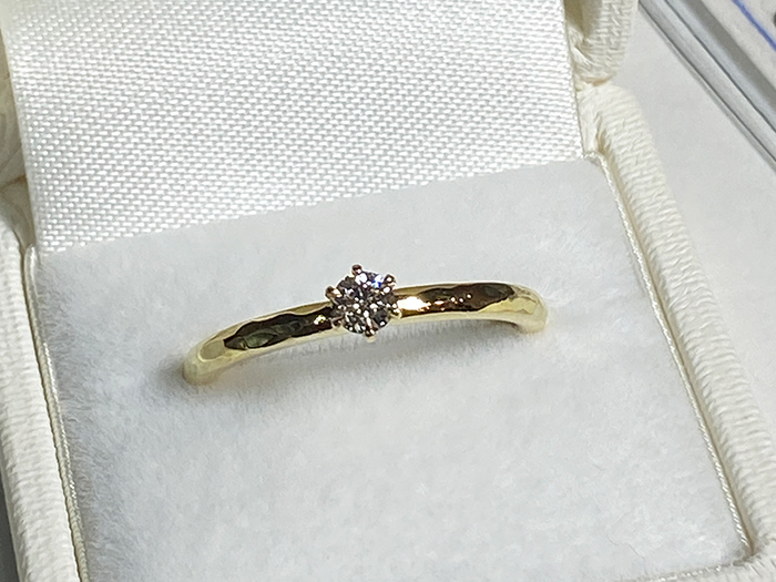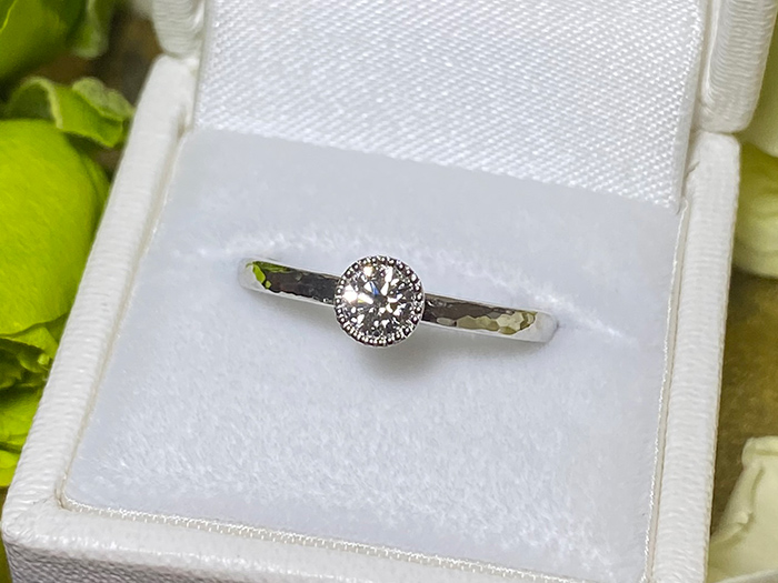 手作り婚約指輪は、0.15ctダイヤモンドをセットしたワンプライス仕様です。 素材はプラチナ(Pt900ハードプラチナ)またはK18イエローゴールド/ピンクゴールドからお選びいただけます。